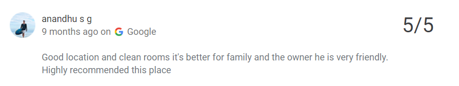 The location is very close to the beach (about 300 m ) it’s a very peaceful place to spend your time.This place is perfect for relaxing yourself with a chilled drink. Rooms are spotlessly clean and large enough to make your stay a comfortable one.